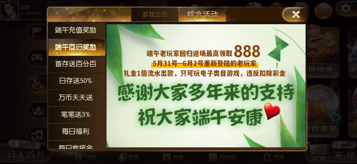 端午老玩家回归返场最高领取888,5月31号–6月2号重新登陆的玩家礼金1倍流水出款