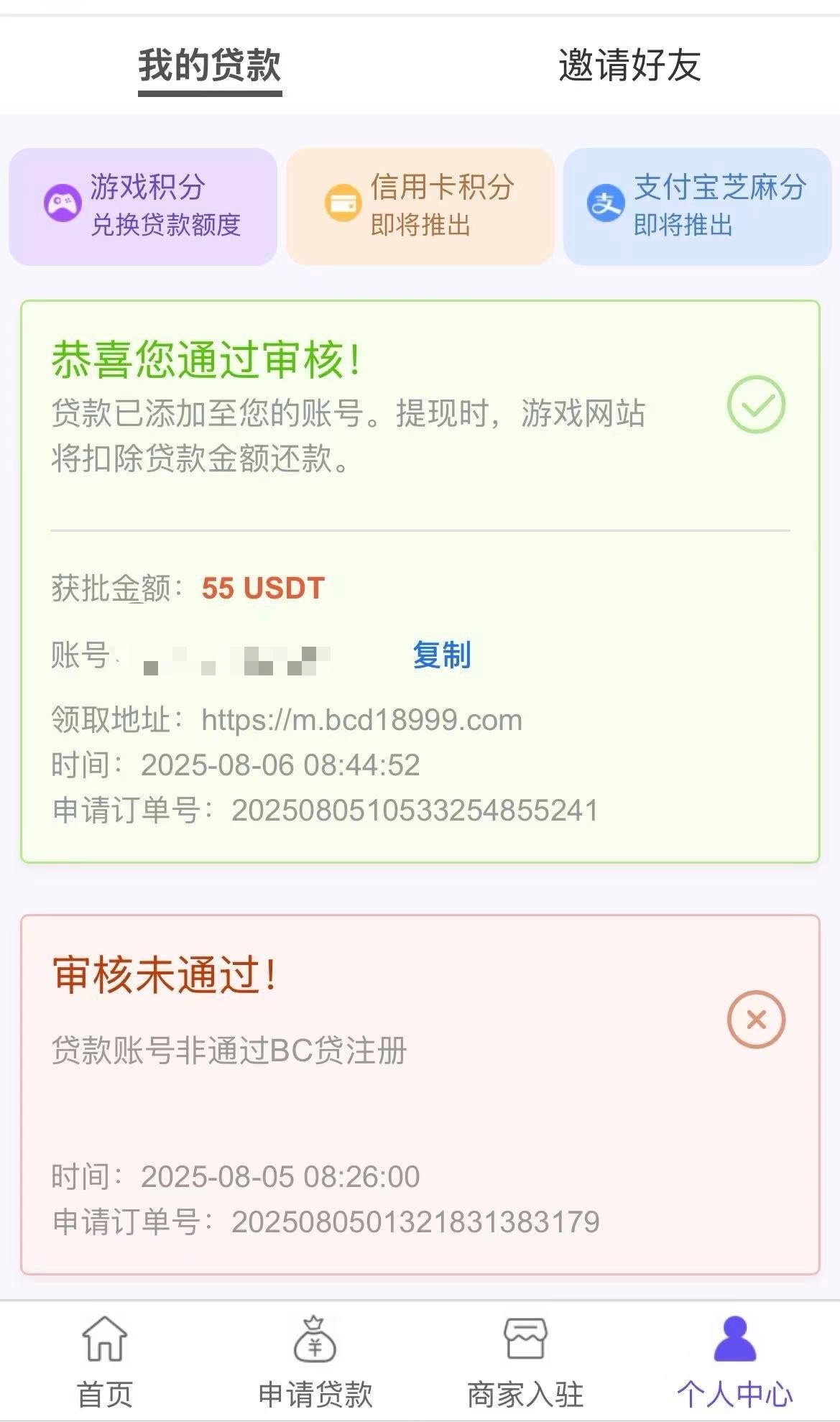 新用户进入网页注册BC贷账号 选择贷款 选择一个BC贷的平台注册绑定收款方式 然后申请贷款 里面填写自己经常玩的平台网址 提供账号密码 按充值提现流水等判定下款金额(必须是网页的平台 不能是app) 基本都是28u~285u不等 等待审核通过去玩就行了 赢了扣除贷款金额即可提款 输了无需还款 注意:平台有电话核实 注意接听 贷款平台注册的电话号码